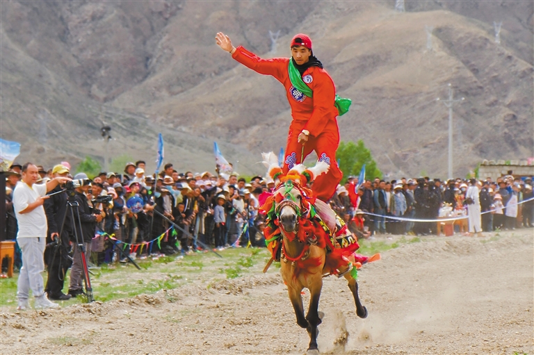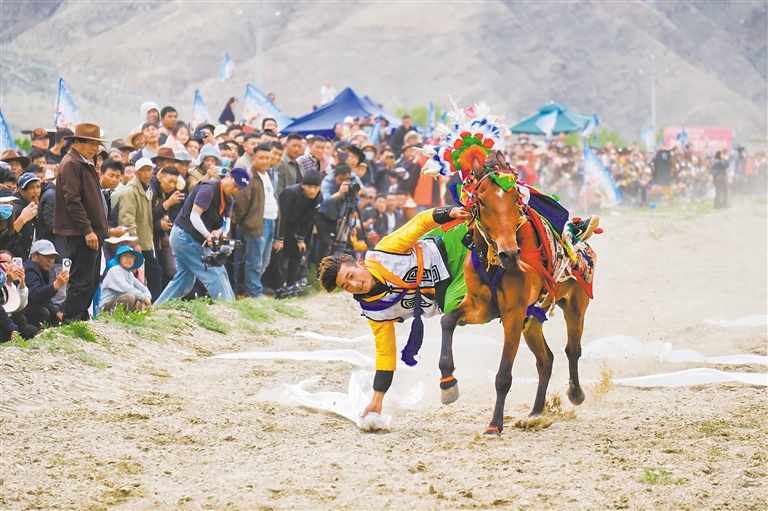 賽馬項目展示了非遺馬具、200米馬術(shù)比賽、短途沖刺賽、趣味挑戰(zhàn)賽等。騎手們緊握韁繩,揮舞著馬鞭,馬匹如離弦之箭飛馳而出,每一個高難度動作,都讓觀眾心跳加速、熱血沸騰。