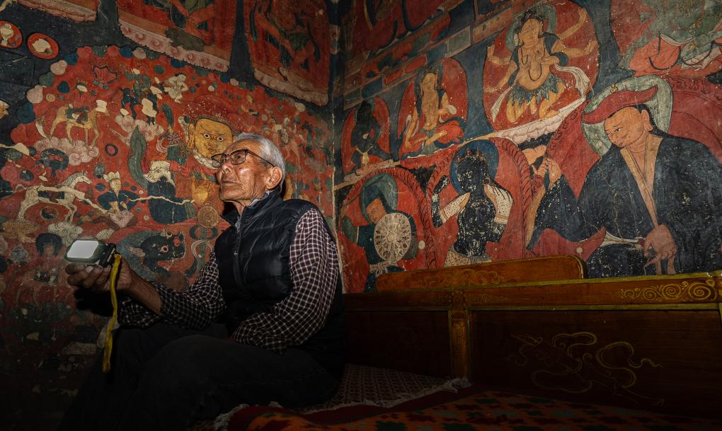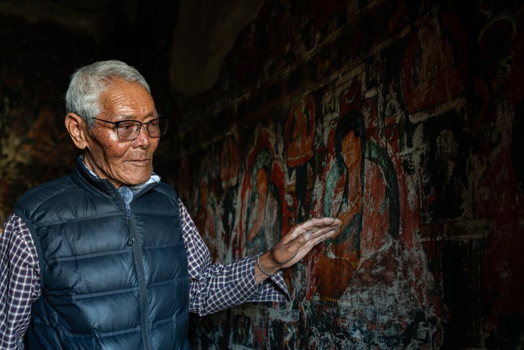 仁增旺扎巡查各個石窟,這是他多年來的習慣(2023年5月26日攝)。