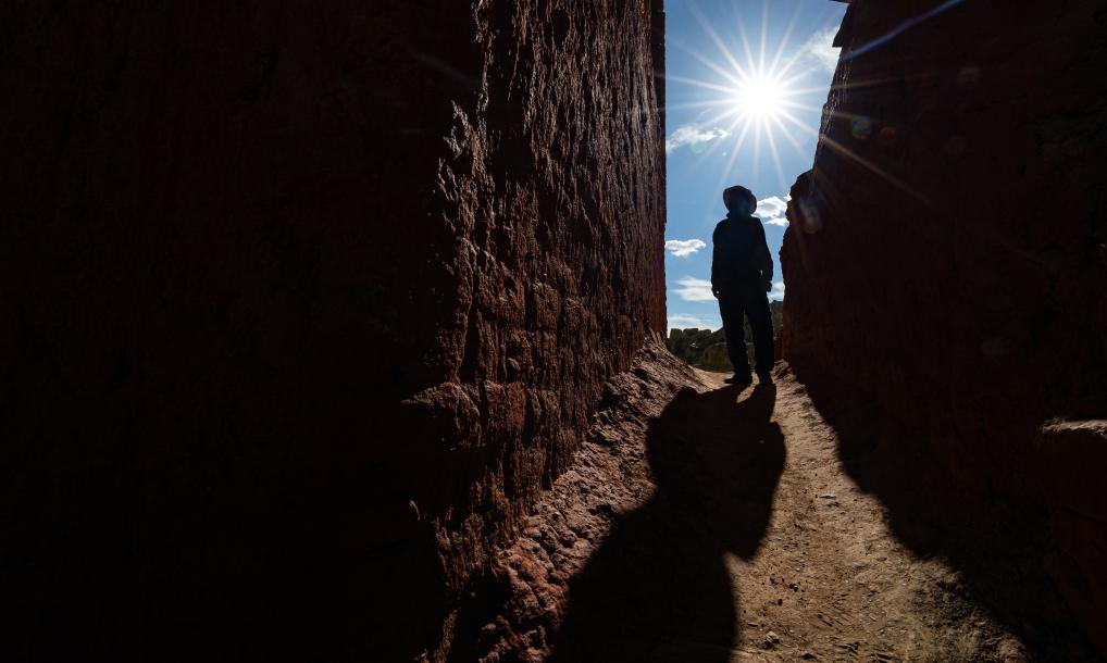 天色漸晚,仁增旺扎走下石窟。夕陽將他佝僂的脊背、彎曲的腿腳,連同二十余載默默守護石窟的時光,一并拉長,烙印在每一級石階上……