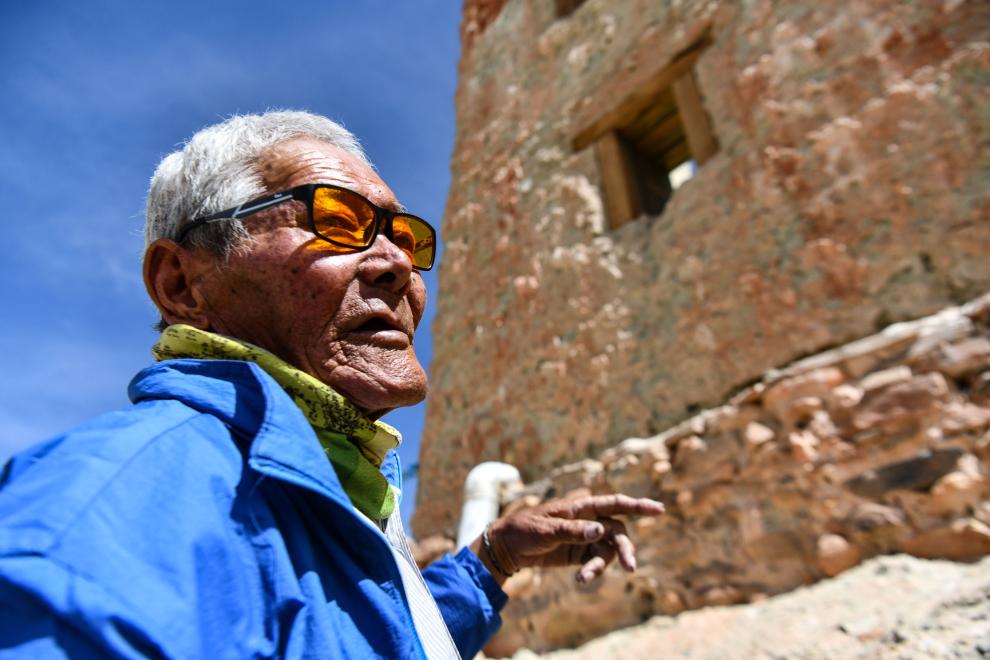 今年77歲的仁增旺扎家住西藏阿里地區(qū)札達縣東嘎村皮央組。他的家與宏偉壯觀的皮央石窟僅咫尺之遙,民居依偎在高聳的石窟群之下,形成了強烈的視覺落差。皮央石窟群與兩公里外的東嘎扎西曲林寺遺址一起組成了西藏最大的佛教石窟遺址——皮央和東嘎石窟遺址。