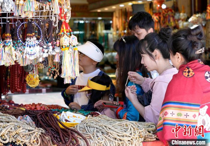 圖為游客在八廓街選購旅游紀念品。中新社記者 李林 攝