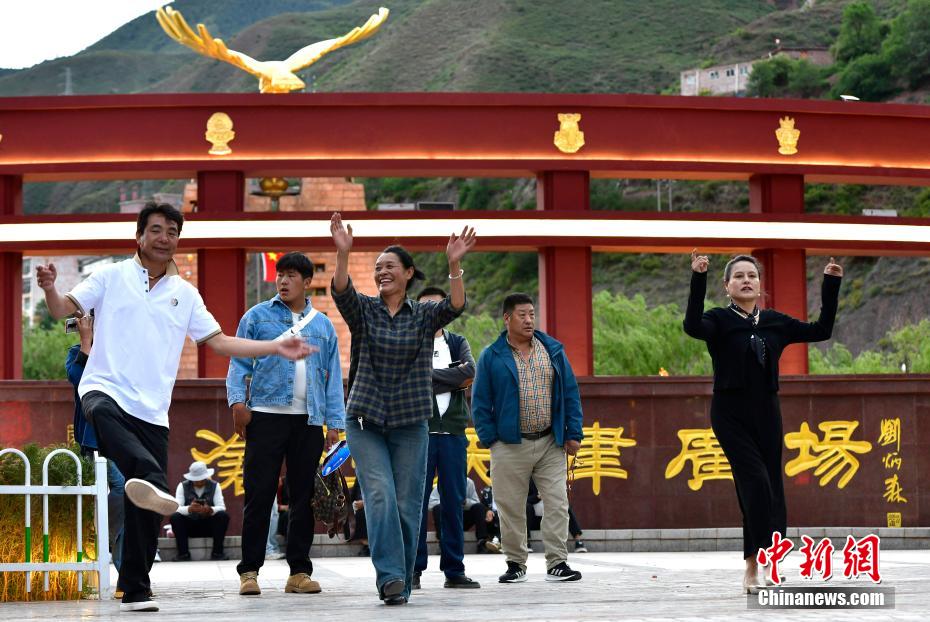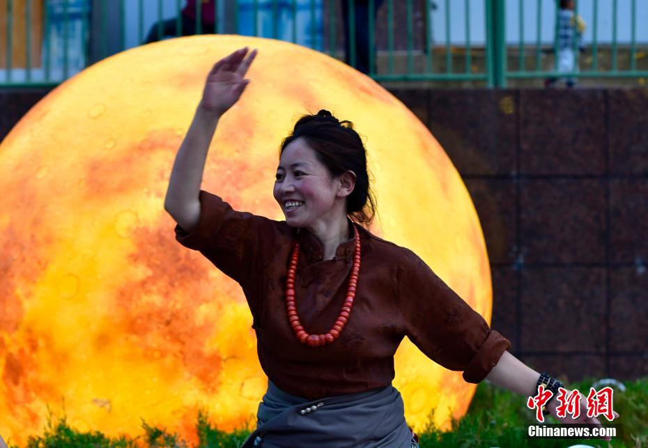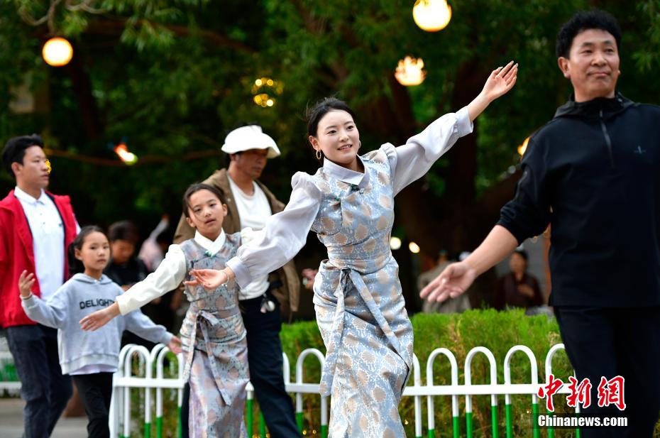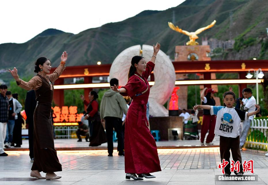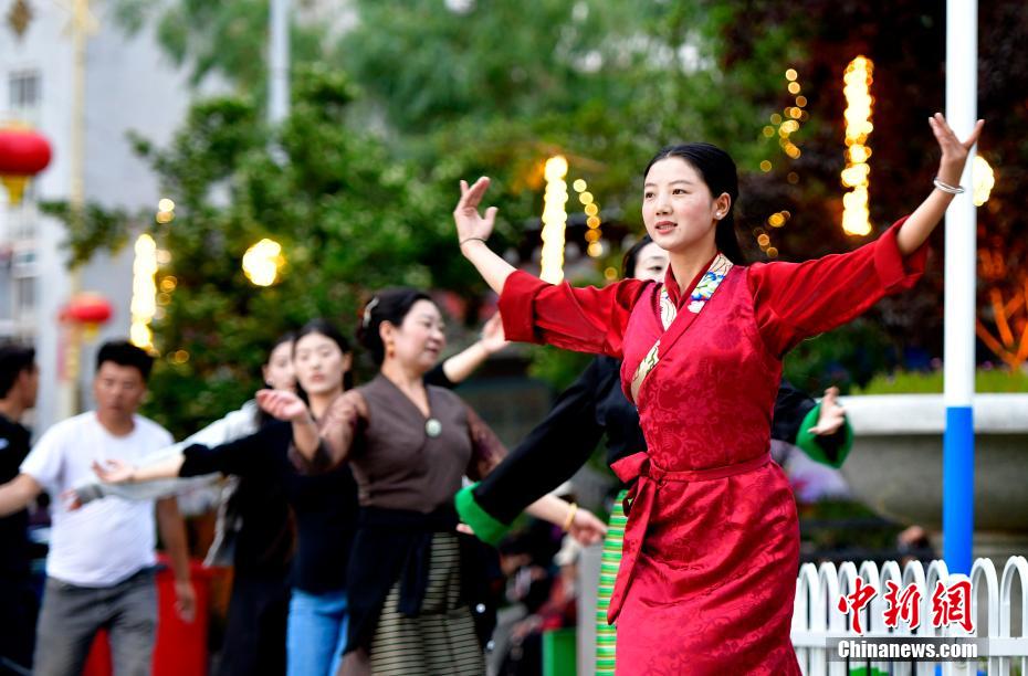 7月13日,西藏昌都瀾滄江天津廣場上,鍋莊舞愛好者踏歌起舞,舞出夏日夜間精彩。中新社記者 李林 攝