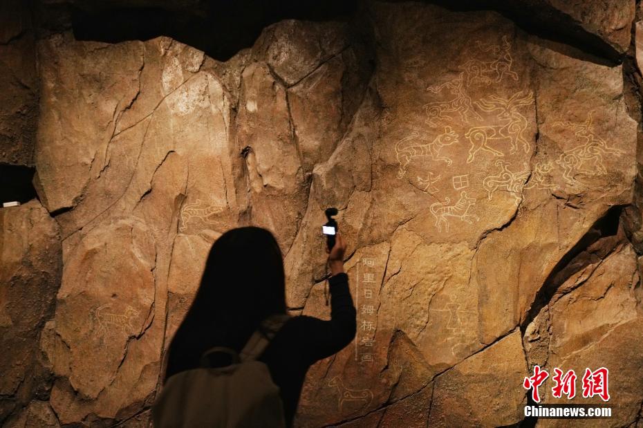 7月15日,在位于西藏拉薩的西藏博物館,觀眾拍攝復(fù)原的阿里日姆棟巖畫。據(jù)了解,西藏博物館設(shè)有基本陳列《雪域長歌—西藏歷史文化展》《離太陽最近的人—西藏民俗文化展》,充分展示西藏地區(qū)歷史發(fā)展進程與文化面貌。中新社記者 張祥毅 攝