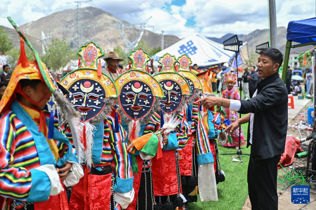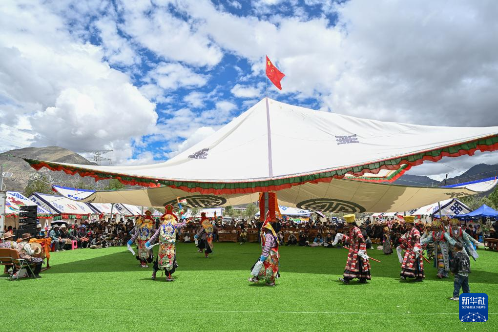 7月16日,民間藏戲表演隊(duì)在南木林縣非遺公園內(nèi)表演湘巴藏戲。新華社記者 李鑫 攝
