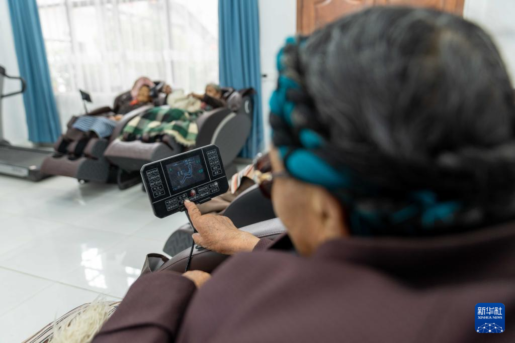 7月17日,老人們在三有村幸福驛站日間照料室的按摩椅上享受按摩。新華社記者 旦增尼瑪曲珠 攝