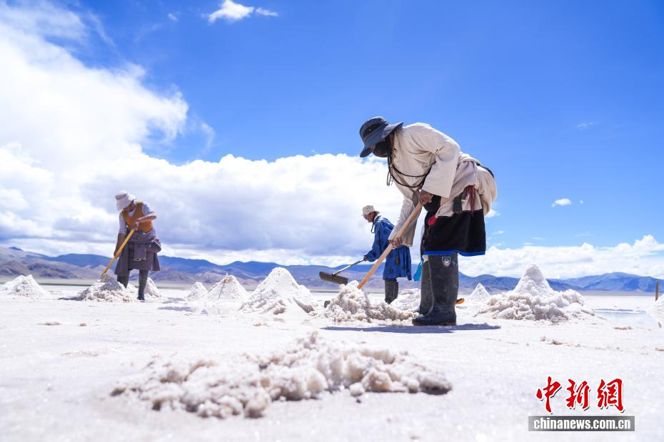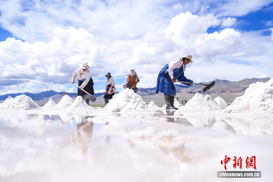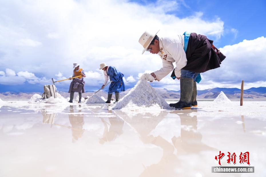 7月20日,在西藏阿里地區(qū)革吉縣鹽湖鄉(xiāng),民眾在鹽湖中采制粗鹽巴。一千多年前,阿里地區(qū)有50多家駐扎的鹽幫,將自然鹽用羊馱牛背邊放牧邊運輸?shù)姆绞?,運送到普蘭、日喀則、印度、尼泊爾等地,并用以物易物的方式換回青稞、磚茶、布料等日常生活所需的物品,從而孕育了遠負盛名的“鹽羊古道”傳奇。近年來,當?shù)亻_辦粗鹽巴加工廠、打造“鹽羊古道”旅游品牌等方式,使千年“鹽羊古道”煥發(fā)新生機。中新社記者 張祥毅 攝