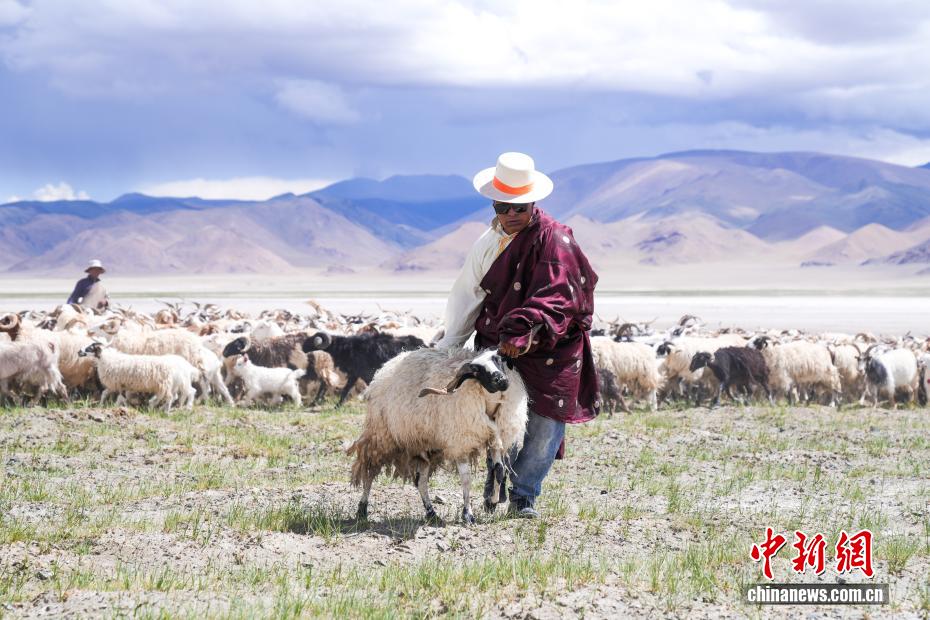 7月20日,在西藏阿里地區(qū)革吉縣鹽湖鄉(xiāng),牧民從羊群中牽引一只將要馱負鹽袋的羊。一千多年前,阿里地區(qū)有50多家駐扎的鹽幫,將自然鹽用羊馱牛背邊放牧邊運輸?shù)姆绞?,運送到普蘭、日喀則、印度、尼泊爾等地,并用以物易物的方式換回青稞、磚茶、布料等日常生活所需的物品,從而孕育了遠負盛名的“鹽羊古道”傳奇。近年來,當?shù)亻_辦粗鹽巴加工廠、打造“鹽羊古道”旅游品牌等方式,使千年“鹽羊古道”煥發(fā)新生機。中新社記者 張祥毅 攝