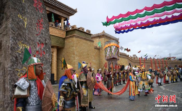 2019年9月16日,四川甘孜縣格薩爾王城暨百村產(chǎn)業(yè)基地舉行開(kāi)城儀式,城內(nèi)以格薩爾故事打造的景觀小品體驗(yàn)地有1000余處,游客可聽(tīng)《格薩爾》說(shuō)唱、看《格薩爾》藏戲等。中新社記者 劉忠俊 攝