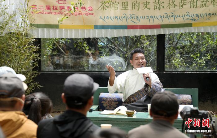 2025年4月20日,格薩爾說(shuō)唱藝人斯塔多吉在拉薩甜茶館里演繹格薩爾說(shuō)唱。中新社記者 李林 攝