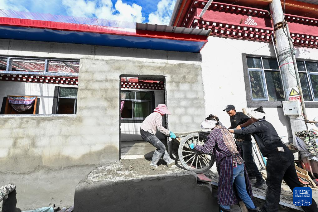7月21日,51歲的拉丁雪村村民次旺羅布(右二)在村民的幫助下運(yùn)輸建筑材料,改造提升自己的房屋。新華社記者 李鑫 攝