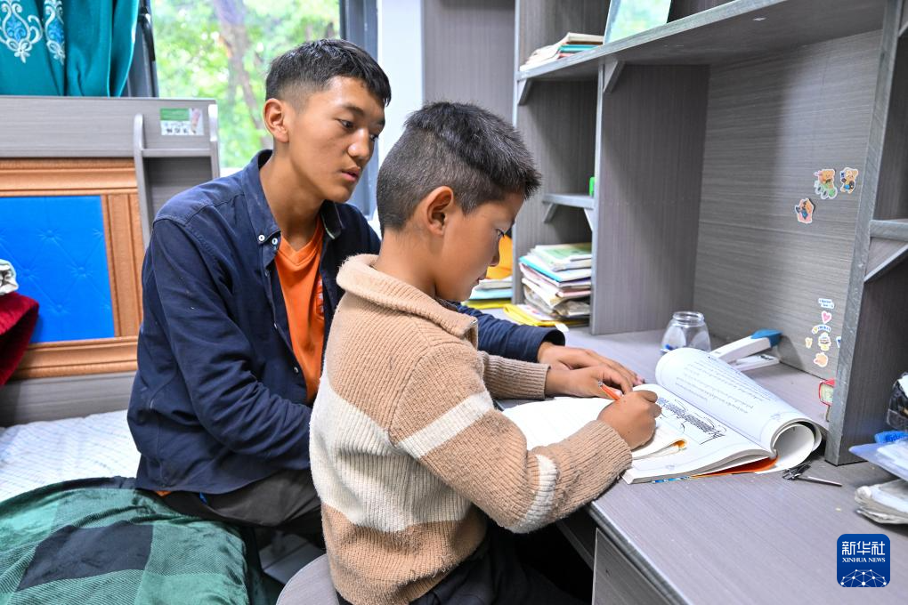 7月21日,17歲的米瑪次仁(左)在新房臥室內(nèi)輔導(dǎo)7歲的弟弟堅(jiān)阿達(dá)瓦寫作業(yè)。新華社記者 李鑫 攝