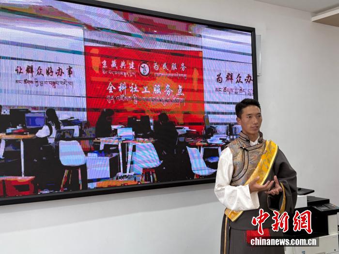 7月24日,拉薩市羊達(dá)鄉(xiāng)通嘎社區(qū)工作人員剛組次仁介紹“e”站情況。中新網(wǎng)記者 張東方 攝