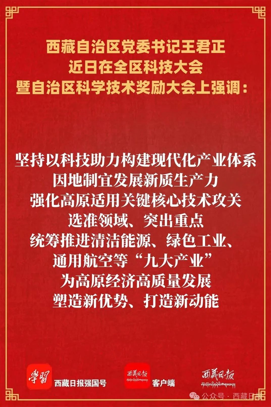 近日,全區(qū)科技大會(huì)暨自治區(qū)科學(xué)技術(shù)獎(jiǎng)勵(lì)大會(huì)在拉薩召開,自治區(qū)黨委書記王君正出席并講話。他強(qiáng)調(diào),要深入貫徹落實(shí)習(xí)近平總書記關(guān)于科技創(chuàng)新、西藏工作的重要指示和新時(shí)代黨的治藏方略,加快推動(dòng)科技事業(yè)發(fā)展,為社會(huì)主義現(xiàn)代化新西藏建設(shè)提供堅(jiān)實(shí)科技支撐。