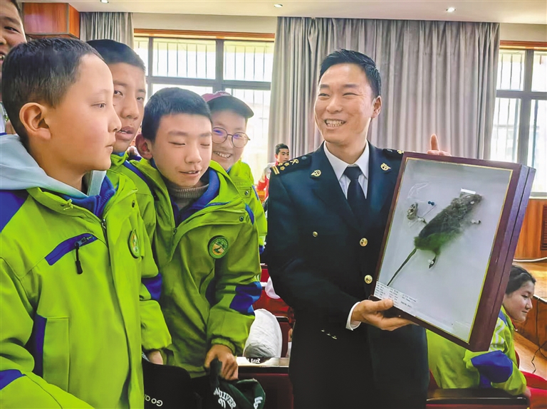 “同學(xué)們,這個圓柱形的赤褐色小蟲子,大家知道是什么嗎?它可是木材的‘隱形殺手’……”近期,在拉薩市第七中學(xué)課堂上,海關(guān)關(guān)員通過實物標(biāo)本展示,向120余名師生生動講解檢疫性有害生物雙鉤異翅長蠹的危害?;顒蝇F(xiàn)場,海關(guān)關(guān)員通過展示外來入侵物種標(biāo)本、講解“異寵”及外來物種入侵危害知識,幫助同學(xué)們了解《中華人民共和國生物安全法》等相關(guān)法律法規(guī),引導(dǎo)青少年樹立生物安全意識,積極守護(hù)生態(tài)安全。