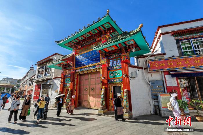 8月1日,藍(lán)天下,拉薩清真大寺的大門體現(xiàn)出斗拱結(jié)構(gòu)和藏式涂裝風(fēng)格的結(jié)合。中新社記者 江飛波 攝