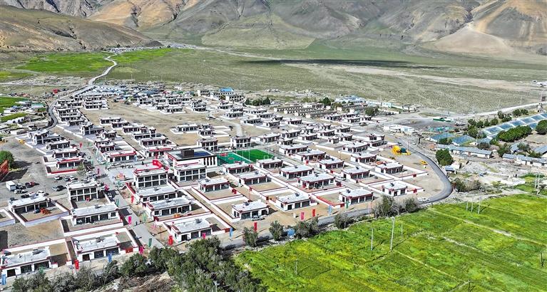 高原夏日燦爛的陽(yáng)光灑落在森嘎村,給一排排新落成的房屋披上了金色的光輝,繪制新彩的門窗閃耀奪目的光彩,一面面鮮艷的五星紅旗在屋頂上獵獵招展……