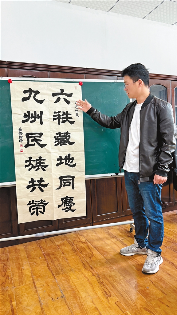 作為西藏自治區(qū)青年聯(lián)合會委員、西藏自治區(qū)青年書法家協(xié)會理事,徐帥的作品多次獲獎,但他更珍視的是傳承的意義。他在校園開設書法篆刻工作室,教藏族同學刻自己的名字印章,也向當?shù)厮嚾苏埥滩匚淖碳记?。如今,這位即將畢業(yè)的碩士研究生,最大的愿望是舉辦一場個人篆刻藝術展。