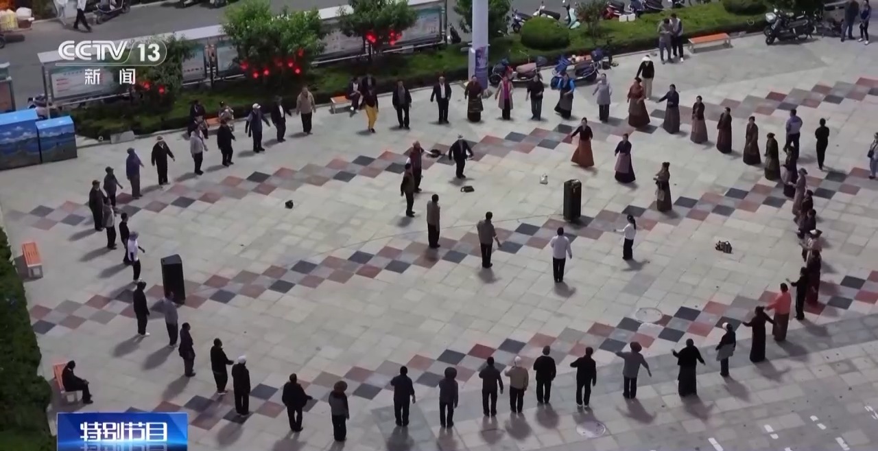 傍晚時(shí)分,社區(qū)居民吃過晚飯就會(huì)來到廣場(chǎng),圍在一起跳起藏式廣場(chǎng)舞“鍋莊”。