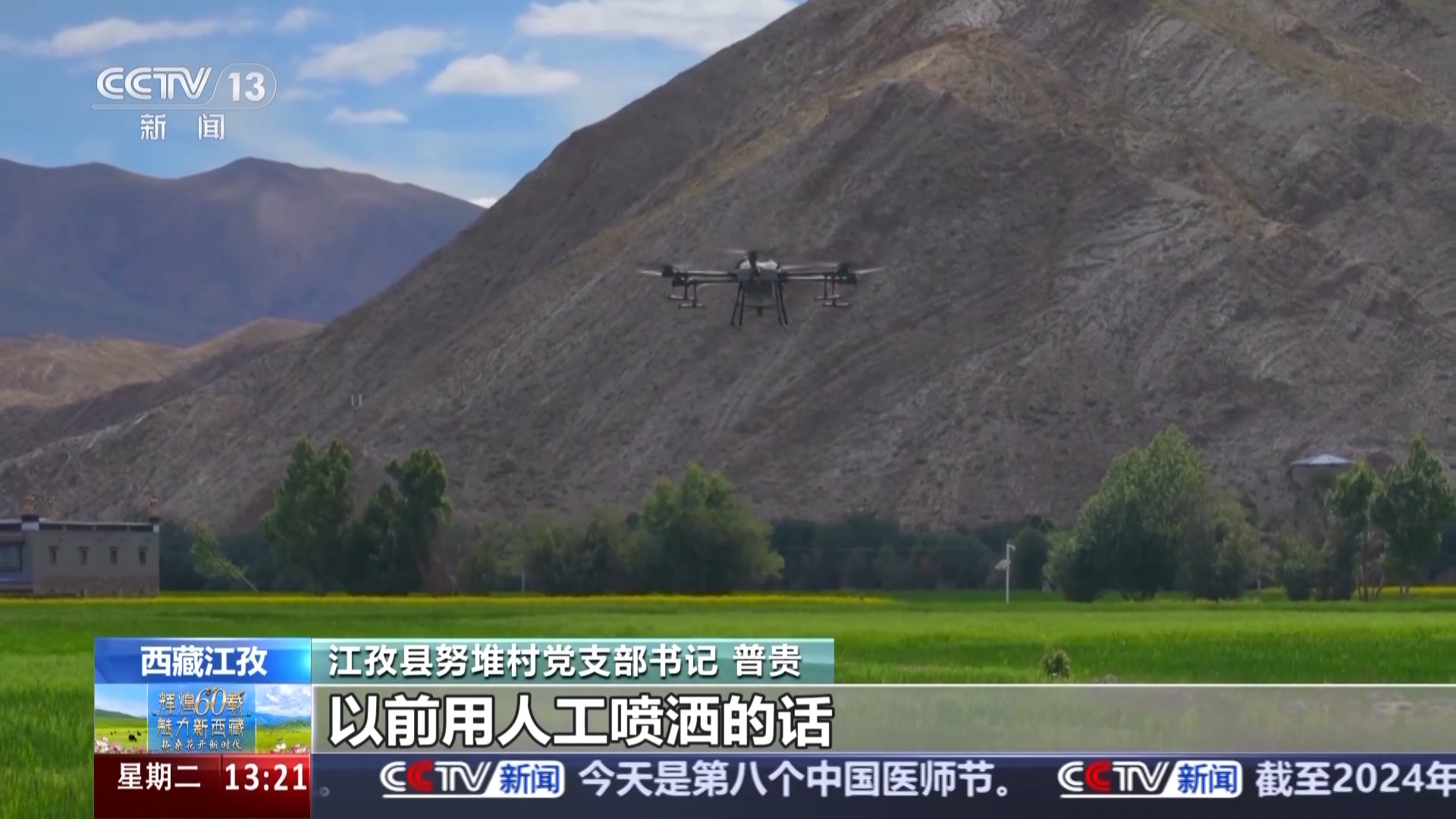 西藏日喀則市江孜縣努堆村黨支部書記 普貴:這幾天我們正在給青稞噴灑葉面肥,以前人工噴灑,一畝地需要半小時(shí)左右?,F(xiàn)在用無人機(jī),半小時(shí)能噴灑30多畝地,我們村的2500多畝地大概需要兩天就能完成。