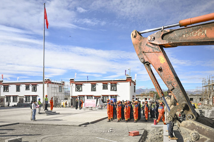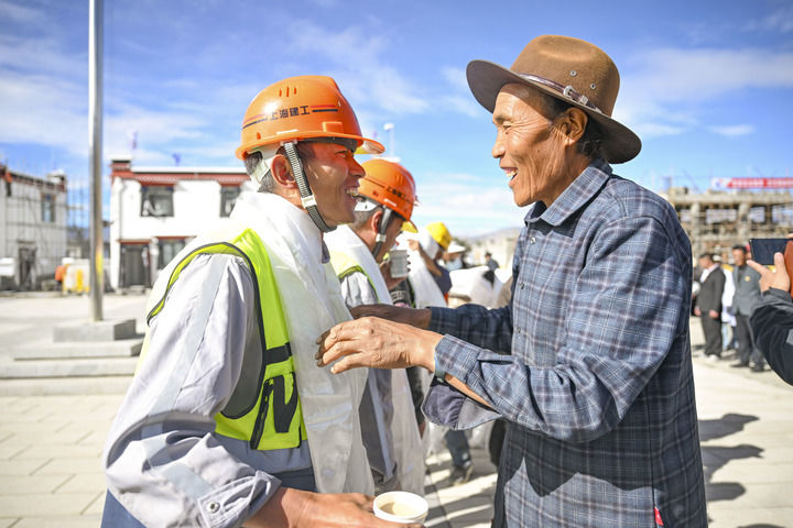 機(jī)器的轟鳴聲與悠揚(yáng)的藏民族歌曲交織在一起,村民們依次向援建者獻(xiàn)上潔白的哈達(dá)、斟滿飄香的酥油茶,還有村民用大拇指蘸著白色的糌粑在他們身上點(diǎn)個(gè)指印,宛如一個(gè)個(gè)真誠的“點(diǎn)贊”,場(chǎng)景溫暖感人。