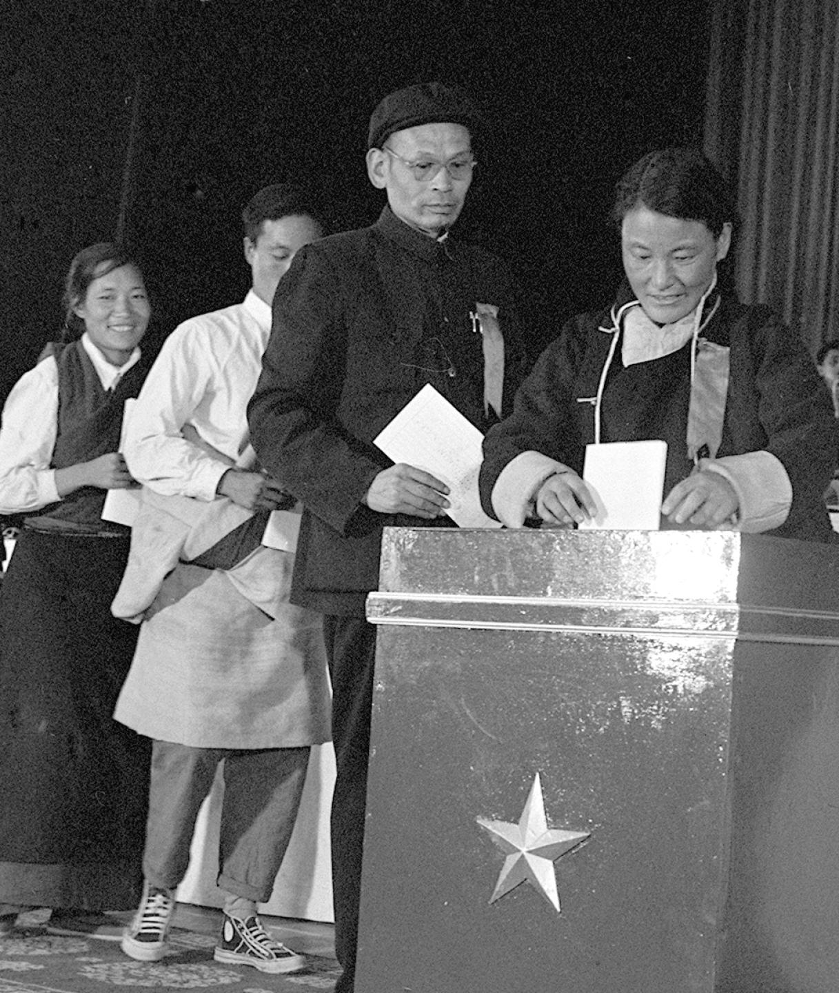 1965年9月,西藏自治區(qū)第一屆人民代表大會第一次會議的代表次仁拉姆(右一)正在投票。新華社記者袁克忠攝