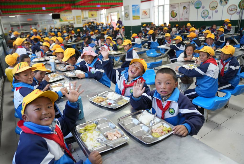 2024年9月3日,西藏林芝市工布江達(dá)縣娘蒲鄉(xiāng)中心小學(xué)的學(xué)生們在享用午餐。新華社記者 晉美多吉 攝