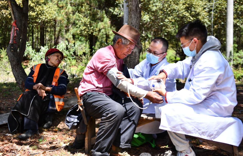 2023年6月12日,廣東援藏醫(yī)生王振疆(右二)和本地醫(yī)生尼瑪益西(右一)在西藏米林市吞布容村,給村民普布多吉檢查身體。 新華社記者 晉美多吉 攝