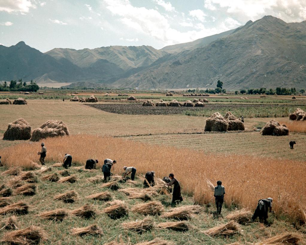1965年,堆龍德慶縣(現(xiàn)為堆龍德慶區(qū))南崗鄉(xiāng)互助組組員們在收割莊稼。新華社記者 吳祖政 攝