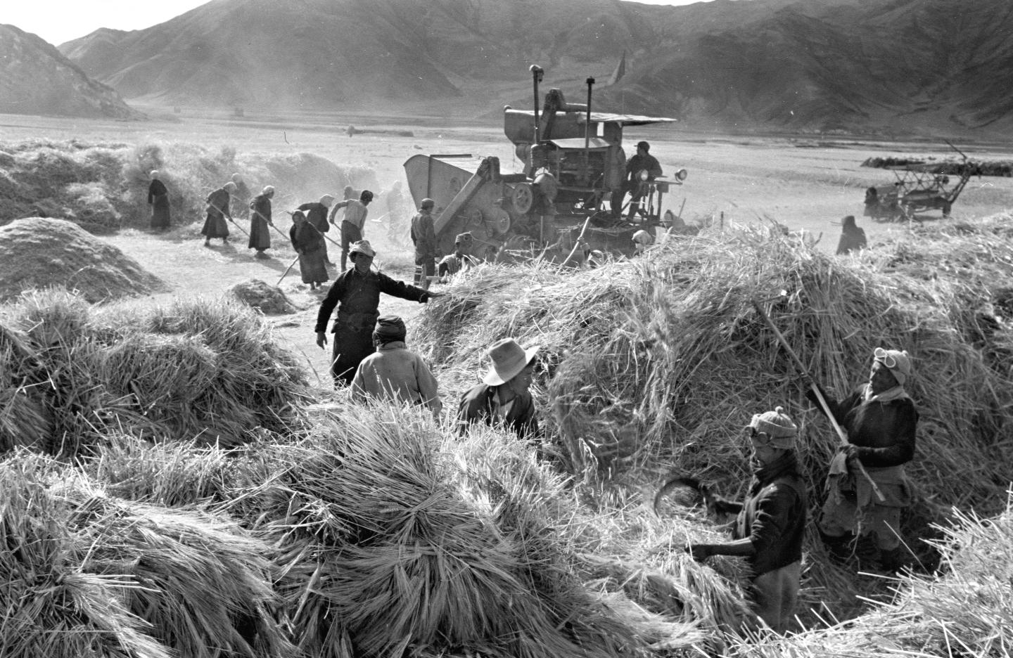 1965年,西藏國營澎波農(nóng)場的藏族工人在使用農(nóng)機(jī)脫粒。新華社記者 吳祖政 攝