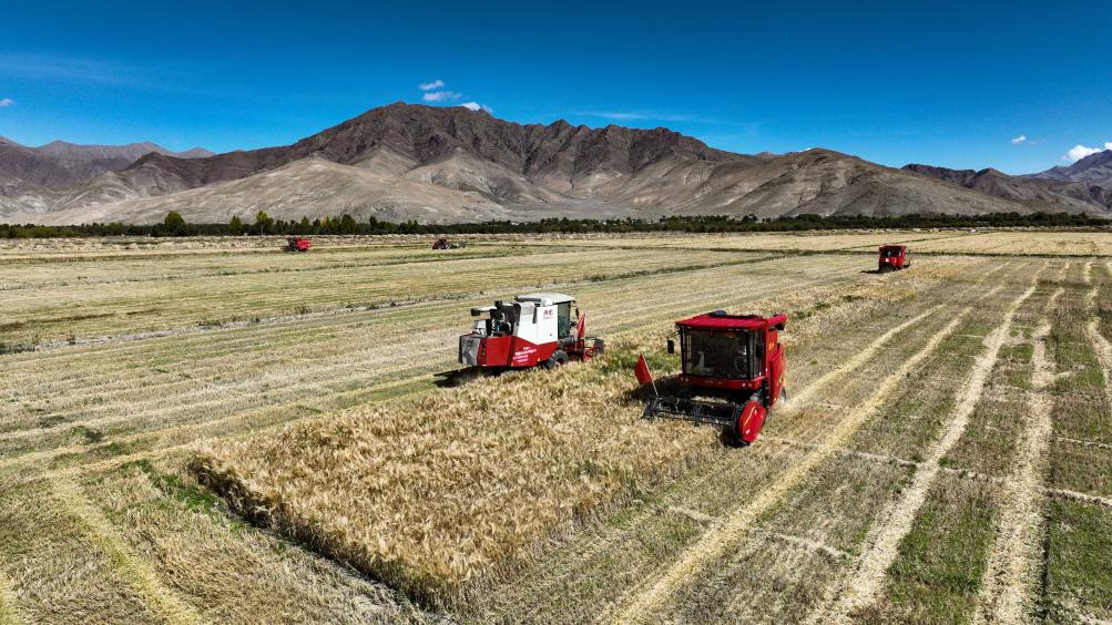 2022年9月19日,西藏日喀則市江孜縣熱索鄉(xiāng)努康村農(nóng)機(jī)合作社的村民集中對村里三千多畝耕地進(jìn)行機(jī)械化收割。新華社記者 晉美多吉 攝