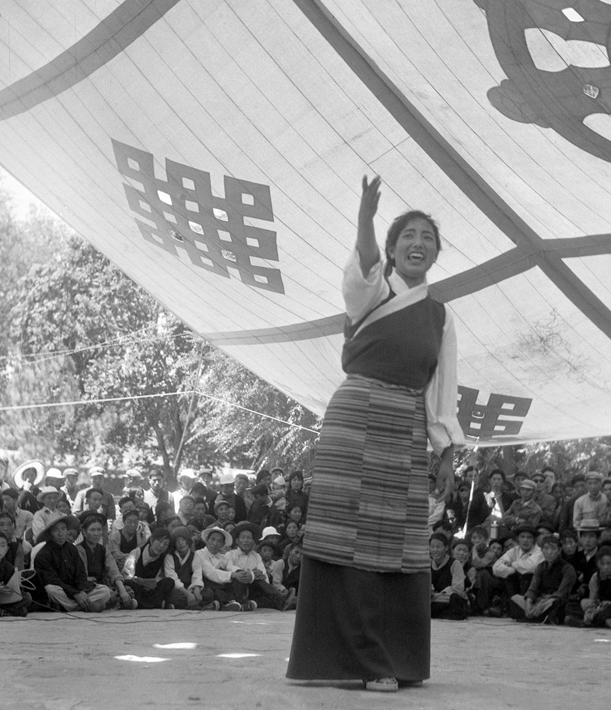 1965年10月,在西藏拉薩各族各界群眾慶祝自治區(qū)成立聯(lián)歡會上,西藏文化工作隊隊員雍西在演出。新華社記者 林楓 攝