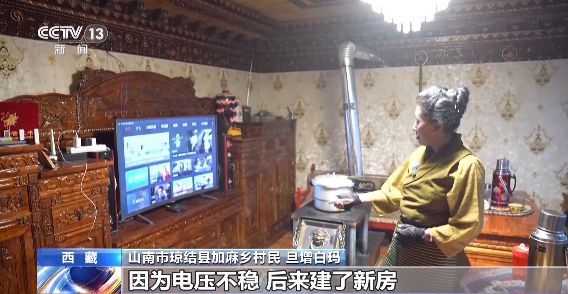 山南市瓊結(jié)縣加麻鄉(xiāng)村民 旦增白瑪:這個是2023年新建的,這邊是以前住的地方,只有一個燈泡,其他家電也不敢用,因?yàn)殡妷翰环€(wěn)。后來建了新房,現(xiàn)在電壓穩(wěn)了,可以放心看電視,而且還買了很多新家電,冰箱、洗衣機(jī)、電視。