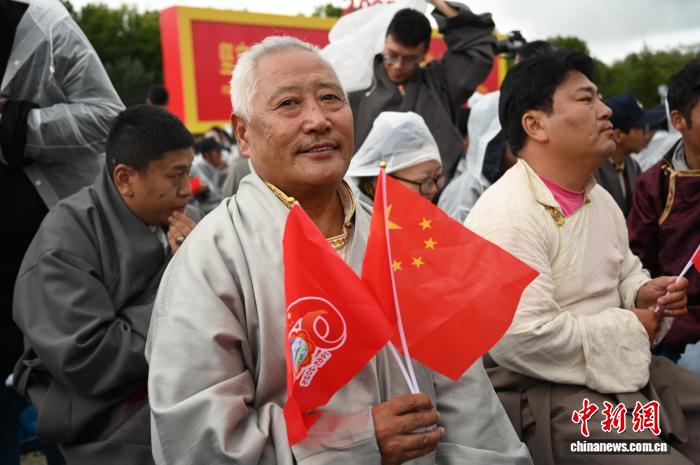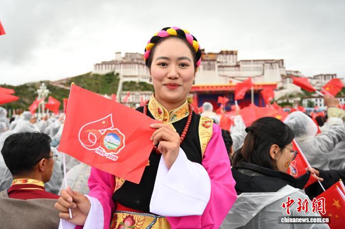 8月21日,拉薩古城居民羅桑群佩在布達(dá)拉宮廣場(chǎng)參加慶祝活動(dòng)。中新社記者 趙朗 攝