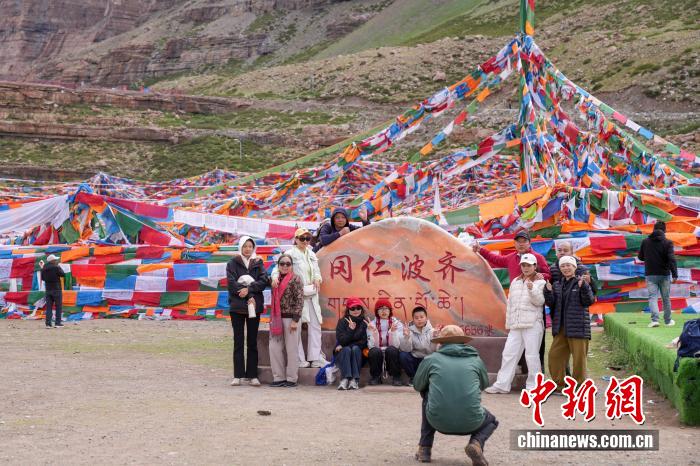 2025年7月21日,游客在岡仁波齊山腳下的經(jīng)幡廣場打卡拍照。岡仁波齊位于西藏阿里地區(qū)普蘭縣境內(nèi),是藏傳佛教的神山之一,每年吸引眾多信徒前往轉(zhuǎn)山。中新社記者 張祥毅 攝