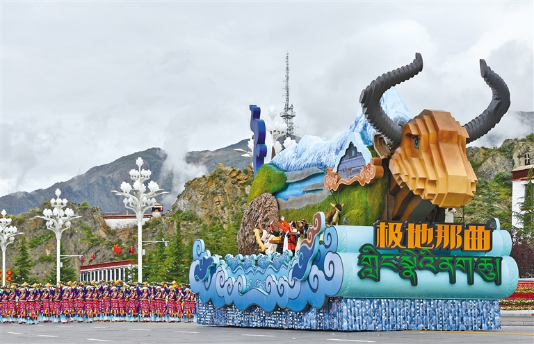 在慶祝大會(huì)群眾游行環(huán)節(jié),9輛主題彩車成為最耀眼的明星,與26個(gè)群眾方隊(duì)一起,組成“旗幟引領(lǐng)”“四件大事”“奮進(jìn)新時(shí)代”“走向未來”四大篇章,在歡快鼓點(diǎn)中徐徐前行,鋪展出一幅流動(dòng)的新時(shí)代雪域長(zhǎng)卷。打頭的“旗幟引領(lǐng)”彩車,車頭高擎巨型黨旗,八面五星紅旗緊隨其后,昭示各族兒女永遠(yuǎn)心向黨中央。收尾的“走向未來”彩車,車身以數(shù)字“60”為主體,華表、紅飄帶、中國(guó)結(jié)環(huán)列四周,宣示建設(shè)團(tuán)結(jié)富裕文明和諧美麗的社會(huì)主義現(xiàn)代化新西藏的堅(jiān)定決心。首尾呼應(yīng)的紅色,將整場(chǎng)游行化作一曲感恩奮進(jìn)的贊歌。