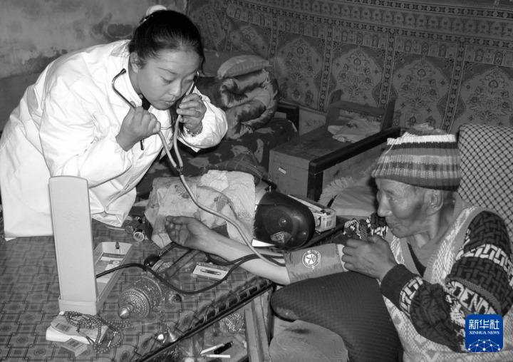 2002年9月13日,青藏鐵路工地的醫(yī)生胡媛媛(左)在為藏族老人扎松檢查身體。自青藏鐵路開工建設(shè)以來,鐵路職工積極為沿線藏族同胞解決吃水、看病等問題,為藏族同胞送溫暖。