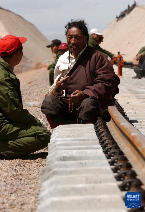 2004年6月20日,第一次見到鐵軌的當(dāng)?shù)夭刈迦罕娕c施工人員在交流。