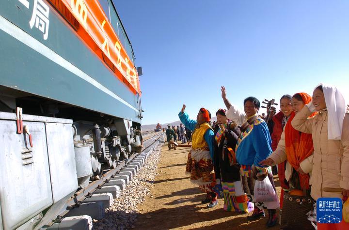 2004年10月10日,藏北群眾迎接火車抵達(dá)那曲。10月9日,青藏鐵路安多至那曲138公里鐵軌鋪設(shè)完成。10月10日,從安多出發(fā)的、西藏境內(nèi)第一列火車,于上午10時抵達(dá)當(dāng)時的藏北重鎮(zhèn)——那曲鎮(zhèn)。
