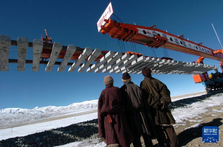 2004年12月5日,在西藏那曲境內(nèi),藏族群眾觀看青藏鐵路鐵軌鋪設(shè)過程。