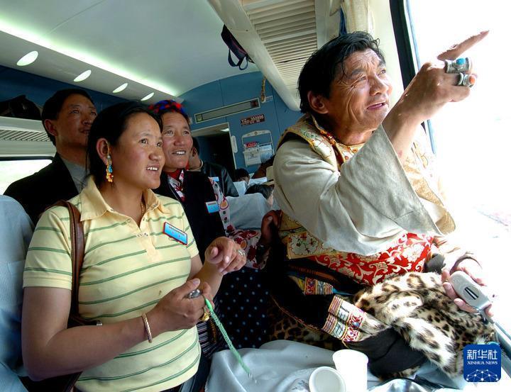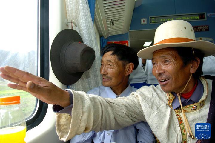 2006年7月1日,烏金(右一)乘坐的“藏2”次列車經(jīng)過自己家鄉(xiāng)安多時,興奮地指向車外,向同伴介紹。