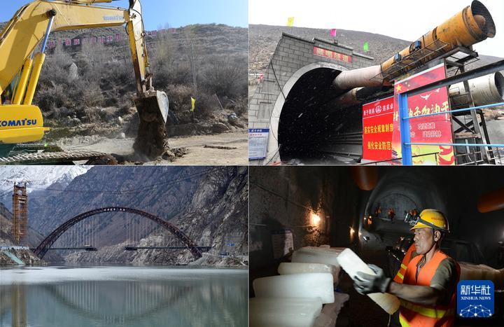 拼版資料左上圖:拉林鐵路西藏桑日縣桑珠嶺隧道開工(2014年12月19日攝);左下圖:施工中的藏木特大橋(2020年4月5日攝);右上圖:拉林鐵路藏嘎隧道施工中(2020年4月5日攝);右下圖:工人把大量冰塊搬進(jìn)桑珠嶺隧道,用來降溫(2017年4月11日攝)。
