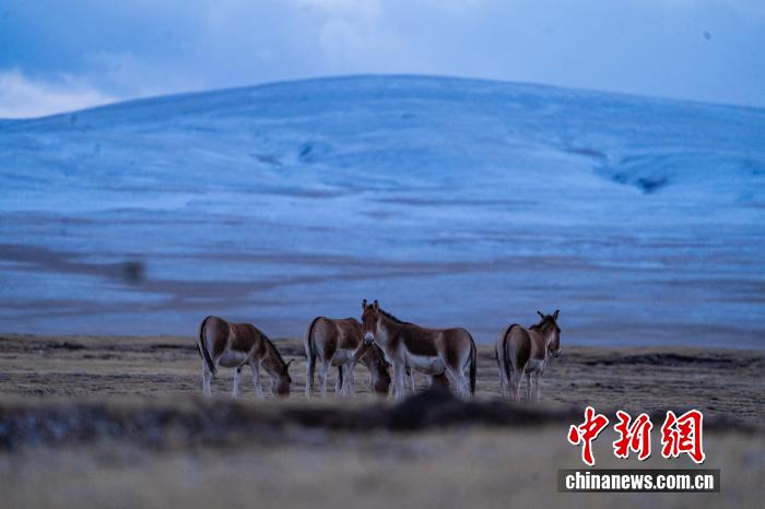 2024年10月23日,中國國家一級保護(hù)動(dòng)物藏野驢在西藏自治區(qū)那曲市安多縣多瑪鄉(xiāng)境內(nèi)的草原上覓食、嬉戲。中新社記者 貢嘎來松 攝
