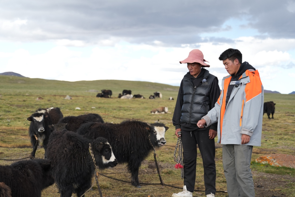 圖為巴登求扎團(tuán)隊(duì)工作人員查看牧區(qū)牦牛情況。何欣然攝
