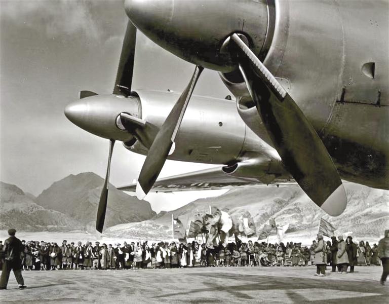 無畏開拓,筑起雪域天路。1955年底,黨中央、國務院作出開辟北京至拉薩民用航線的重要指示。1956年4月26日,當雄草原上建起了簡易跑道;5月26日,韓琳機組駕駛伊爾-12型飛機從北線試航,穿破層層云障,成功降落在雪山環(huán)抱的當雄機場,填補了我國高高原飛行的空白;9月5日,歷時118天,西藏第一座機場——當雄機場建成。此后的10年間,多次組織試飛。1965年3月1日,民航第一飛行大隊孫權(quán)貴和畢春芳機組駕駛伊爾-18型飛機從北京起飛,次日平穩(wěn)降落當雄機場,北京-成都-拉薩航線正式通航,西藏民航波瀾壯闊的發(fā)展篇章就此開啟。