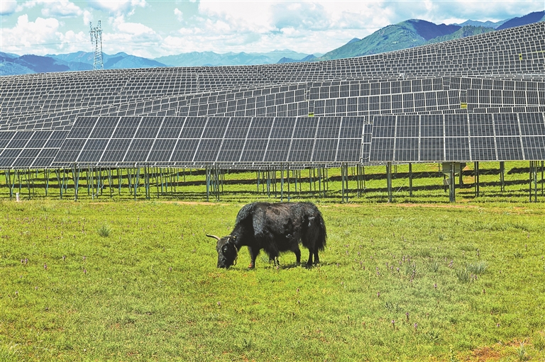 熱瓦鄉(xiāng)熱熱村是典型的牧業(yè)村,位于那曲市索縣的群山峻嶺之間。2023年12月,西藏開投集團(tuán)投資建設(shè)的50MW牧光互補(bǔ)儲能項目在這里并網(wǎng)發(fā)電,遠(yuǎn)遠(yuǎn)望去像是山坡上的“藍(lán)色湖泊”。牧民們每天會趕著羊群來這里放牧,陽光透過光伏板的縫隙灑在草地上,羊群在陰涼下自由覓食。在光伏板的“庇護(hù)”下,不僅山地植被可以免受烈日大風(fēng)的侵襲,還能對養(yǎng)殖的動物起到保護(hù)效果,在充分利用光能優(yōu)勢的同時,為鄉(xiāng)村振興注入新動能,實現(xiàn)企業(yè)和農(nóng)牧民雙向受益。