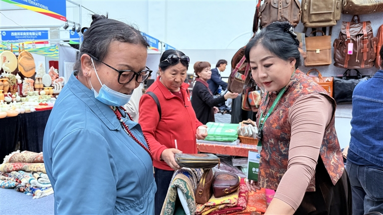 展會現(xiàn)場人頭攢動,熱鬧非凡。150家參展商帶來的特色產(chǎn)品鋪滿了各個展位,空氣中彌漫著多元氣息。法國紅酒的醇厚酒香、印度尼西亞咖啡的濃郁焦香、伊朗藏紅花的獨特芬芳交織在一起,與西藏本土青稞制品的麥香、高原蜂蜜的甜香相互映襯。在巴基斯坦展位前,參展商Asif正熱情地向顧客展示手工羊毛地毯,“我已經(jīng)連續(xù)三年參加,之前銷量都很好,這次帶來的地毯紋樣融入了藏式元素,希望能更受歡迎?!?/p>