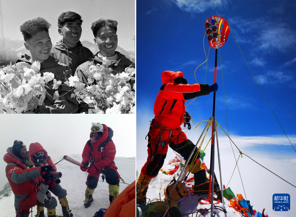 拼版照片:左上圖為1960年5月登上珠穆朗瑪峰頂?shù)闹袊?guó)登山隊(duì)隊(duì)員王富洲(右)、貢布(中)和屈銀華(資料照片 新華社發(fā));左下圖為2008年5月8日,北京奧運(yùn)圣火珠峰傳遞登山隊(duì)隊(duì)員羅布占堆(左)點(diǎn)燃第一棒火炬手吉吉手中的“祥云”火炬(新華社發(fā));右圖為2020珠峰高程測(cè)量登山隊(duì)隊(duì)員在珠穆朗瑪峰峰頂開展測(cè)量工作(2020年5月27日新華社特約記者扎西次仁攝)。新華社發(fā)