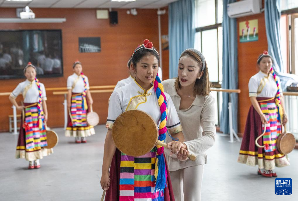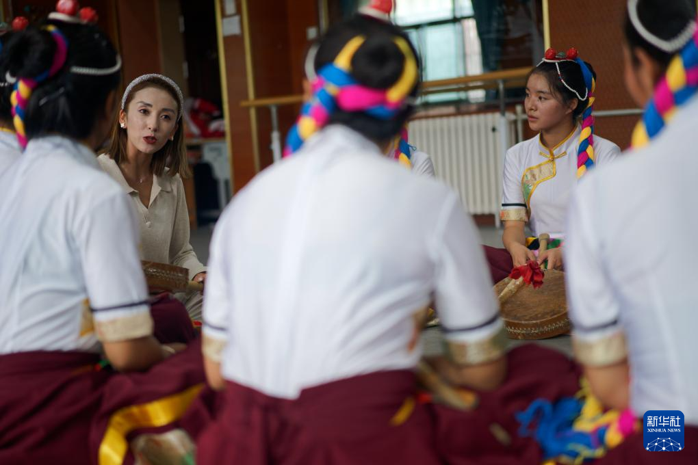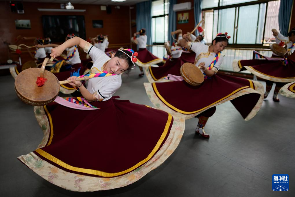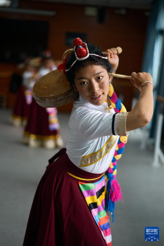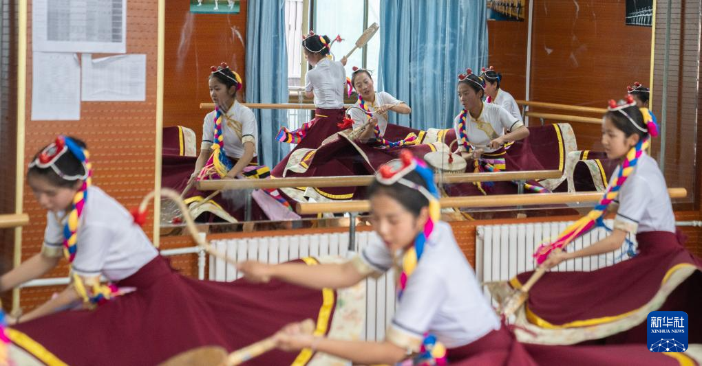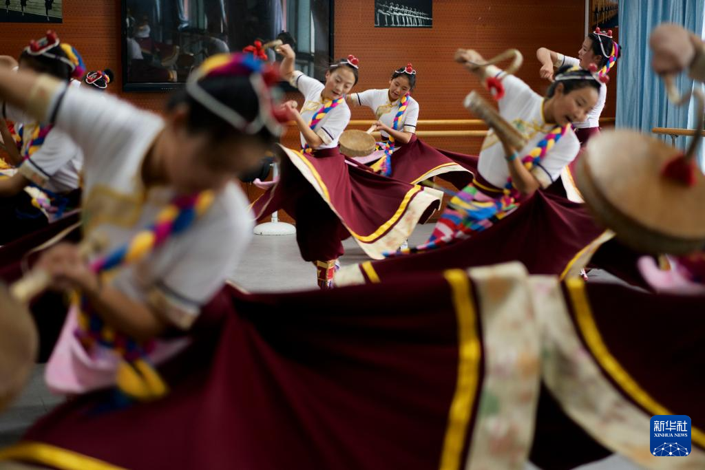 9月9日,在拉薩市第二中等職業(yè)技術(shù)學(xué)校,孩子們?cè)诰毩?xí)熱巴舞。新華社記者 張笑宇 攝