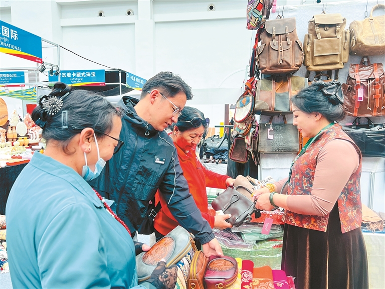 西藏本土特色產(chǎn)品同樣是展會(huì)的亮點(diǎn)。在非遺展區(qū),藝人們正向游客傳授唐卡選購技巧;藏式食品銷售區(qū)更為熱鬧,工作人員為游客遞上酥油茶:“趁熱喝,配青稞餅更地道!”不少游客端碗坐在藏式卡墊上,一邊品嘗一邊交流,手中還拿著剛購買的唐卡圖案布袋,神情喜悅。