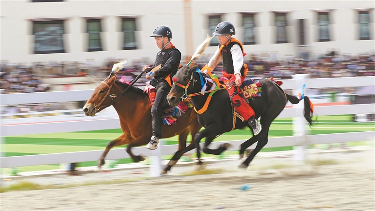 “達(dá)瑪”藏語意為“跑馬射箭”。每年的達(dá)瑪節(jié),賽馬都會吸引十里八鄉(xiāng)的人們前來觀賽。賽馬場上人頭攢動,隨著發(fā)令聲響,一匹匹駿馬如離弦之箭沖出起跑線,騎手俯身貼在馬背上,揚(yáng)鞭馳騁,你追我趕,奮勇爭先。觀眾席上,人們隨著比賽節(jié)奏,時而激動,時而安靜,時而歡呼,時而嘆息。藏族阿媽次仁卓嘎難掩激動,她告訴記者,幾乎每年都會和家人來看賽馬。賽場上,選手們堅韌不拔、昂揚(yáng)向上的精神風(fēng)貌讓人動容,也激勵著一代又一代英雄城兒女為祖國發(fā)展繁榮而不懈奮斗。